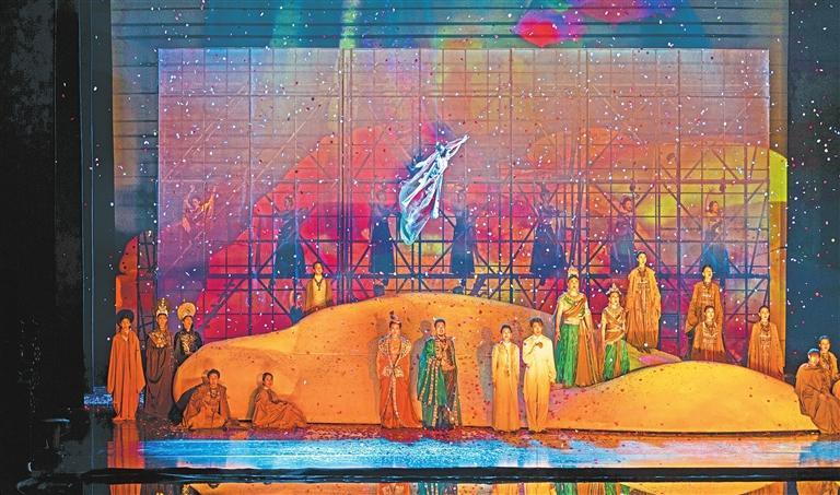 大型原創(chuàng)音樂劇《飛天》以“大愛”立意敘事,打破時空界限,利用現(xiàn)代舞美技術(shù),多維度、多角度、多層次地展現(xiàn)了敦煌石窟的無窮魅力,令觀眾身臨其境、沉浸其中,情感共鳴油然而生,獲得獨特的藝術(shù)體驗。(本文配圖均為《飛天》劇照,由蘭州大劇院提供)