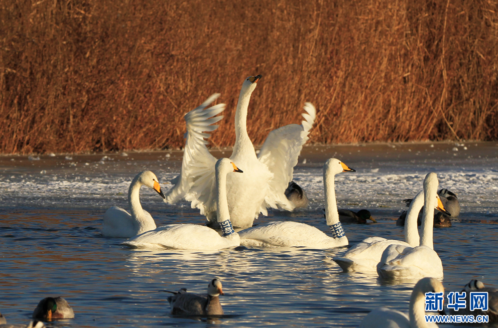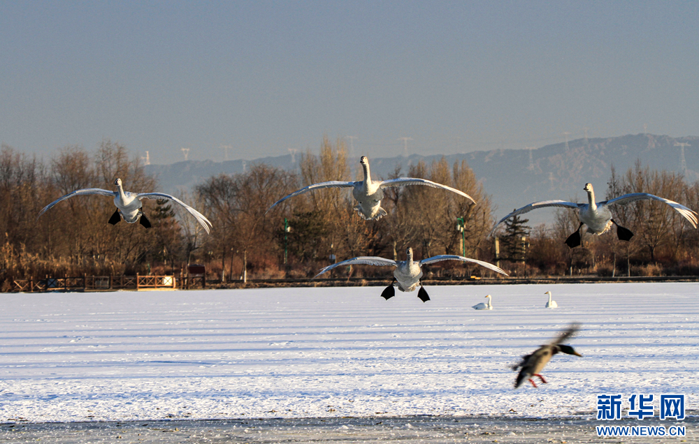 冬日里,在甘肅省張掖國家濕地公園,數(shù)只白天鵝沐浴著陽光悠閑地嬉戲、覓食,呈現(xiàn)出一幅自然和諧的生態(tài)畫卷。新華網(wǎng)發(fā)(陳禮 攝)