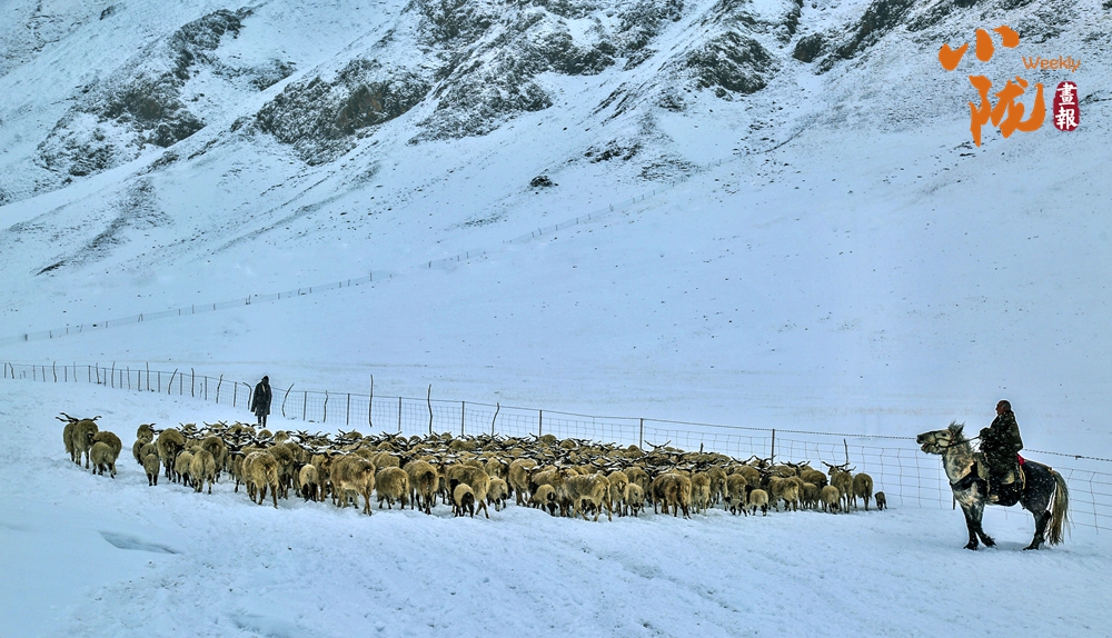 天地一色,萬物寂靜,風雪牧歸。牧民在雪地里放牧牛羊,人和羊在白雪覆蓋的草原上共同演繹著生活的樂章。
