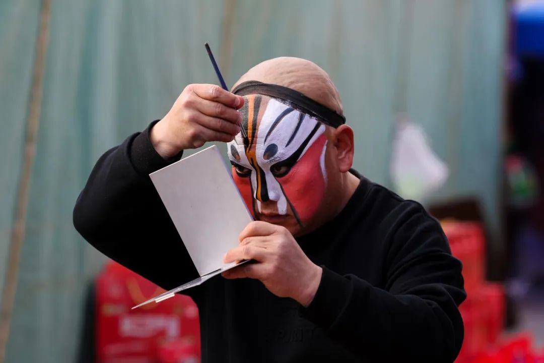 換好戲服,化好戲妝,戴上頭冠,鑼鼓響起,大幕拉開,演員一開口,吼出一嗓高亮秦腔,嘯出黃天厚土的氣魄,臺(tái)下響起震雷般的掌聲。一時(shí)間,臺(tái)上臺(tái)下,你唱我和,慷慨激昂的唱詞從每個(gè)人的胸腔吼出,有熱淚在流,有情緒在涌動(dòng),這是西北人的年,是西北人的歲月狂歡。