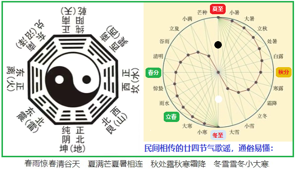 八卦是中華先民理性思維和高度智慧的結(jié)晶。華夏7000年前伏羲創(chuàng)制的八卦圖最初是用來分時紀年的,而在此基礎(chǔ)上發(fā)展起來的廿四節(jié)氣后來卻大放異彩。所謂“太極生兩儀,兩儀生四象,四象生八卦”的陰陽變化,其實指的就是四季輪替,它代表了事務(wù)孕育、發(fā)展、成熟和衰亡的自然規(guī)律,告訴世人“變化,才是永恒不變的規(guī)律”這一本質(zhì)!如果在八卦圖上繼續(xù)往下切分,就能很自然地從八卦圖上得到廿四節(jié)氣(見圖)。