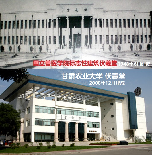 1946年10月國立獸醫(yī)學院成立后,于1948年6月建成了當年蘭州最雄偉壯觀的建筑——伏羲堂。有深厚國學功底的校長盛彤笙,為紀念人文始祖伏羲氏在認識自然、適應(yīng)自然、改造自然和發(fā)展生產(chǎn)生活的過程中,所進行的一系列造福人類的發(fā)明創(chuàng)造,將這幢教學大樓命名為“伏羲堂”,并親自撰寫了一篇銘文《伏羲堂記》,“用追前烈,以志建堂之艱難”。