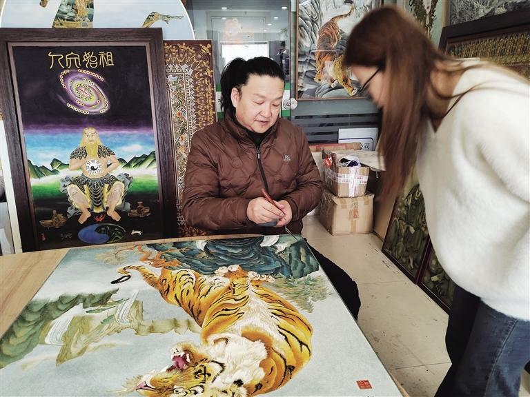 不遠(yuǎn)處的刻葫蘆攤位前,非遺代表性傳承人阮熙越運(yùn)刀如筆,在打磨光潤(rùn)的葫蘆表面刻出圖案。“刻針深淺決定墨色濃淡,蘭州葫蘆皮質(zhì)厚實(shí),才能承載這樣的藝術(shù)語言。”正在體驗(yàn)刻繪的大學(xué)生張萌說。從傳統(tǒng)書畫到現(xiàn)代動(dòng)漫IP,從擺件到車掛,近幾年刻葫蘆在創(chuàng)新中走向大眾。據(jù)文旅部門統(tǒng)計(jì),非遺購(gòu)物月期間刻葫蘆銷售火熱,成為最受游客青睞的“蘭州名片”。