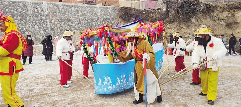旱般表演時(shí)節(jié)奏由慢漸快,闖激流、過險(xiǎn)灘,同時(shí),彩扇、華燈秧歌隊(duì)協(xié)同表演,并以《十道河》《迎春歌》等伴唱,用三弦、二胡、笛子等伴奏的隴上民間小調(diào)烘托氣氛。