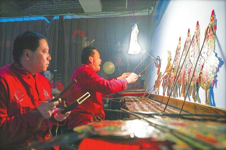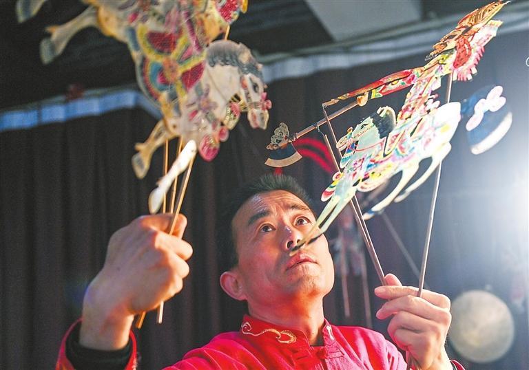 近日,記者走進(jìn)環(huán)縣環(huán)州故城道情皮影館,燈光暗去,音樂(lè)響起,泛黃的幕布后,市級(jí)非遺代表性傳承人許明堂的“老道情”吼起來(lái),在他的十指轉(zhuǎn)動(dòng)間,幕布上的皮影人物“活”起來(lái):坐臥、行走、提袍甩袖,伴隨著各種樂(lè)器,一場(chǎng)精彩的《羅通掃北》皮影戲上演。
