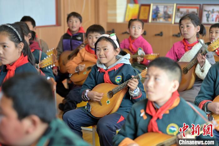 中新社記者近日探訪瑪曲縣寄宿制藏族小學(xué)彈唱社團活動,未進教室,已聽到室內(nèi)傳出的歡快琴聲和笑聲。