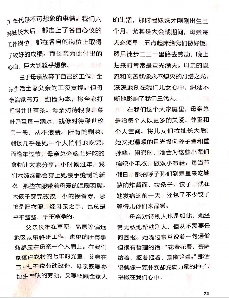 父親長年在草原、高原等偏遠(yuǎn)地區(qū)從事科研工作,家里的所有事務(wù)都壓在母親一個人肩上。在我們家落戶農(nóng)村的七年時光里,父親在五·七干校勞動改造,母親既要參加生產(chǎn)隊的勞動,又要照顧全家人的生活,那時我妹妹才剛剛出生三個月。尤其是大會戰(zhàn)期間,母親每天必須早上五點起床給我們做好飯,然后徒步二三十里路去勞動,晚上歸來時常常是星光滿天。母親的隱忍和吃苦就像永不熄滅的燈塔之光,深深地刻在我們兒女心中,綿延不斷地影響了我們?nèi)恕?/p>