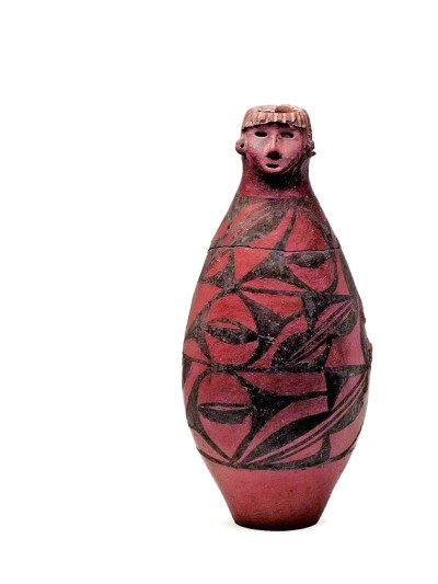 這只彩陶瓶的瓶口,被塑造成一位少女的頭像。她面龐秀麗,齊額短發(fā)整齊利落,發(fā)梢層次錯落,有著現(xiàn)在年輕人喜歡的空氣感。腦后留著披肩發(fā),鼻梁挺直,嘴唇小巧,微微張開,似乎講述著遠古的故事。少女耳部有穿孔,說明她曾經(jīng)“佩戴耳環(huán)”。少女頭像與渾圓的瓶腹部自然銜接,整體呈現(xiàn)出優(yōu)雅的流線型輪廓。瓶身繪有弧三角構(gòu)葉豆莢紋飾,如同綻放的花瓣包裹著陶瓶。