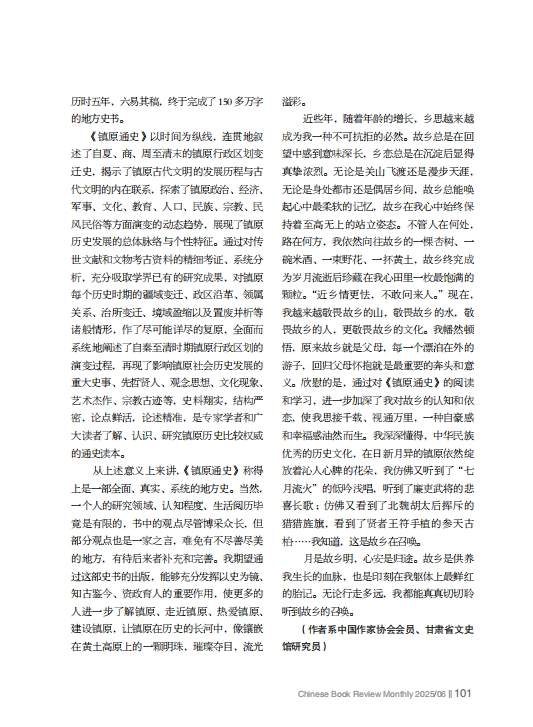從上述意義上來講,《鎮(zhèn)原通史》稱得上是一部全面、真實、系統(tǒng)的地方史。當然,一個人的研究領域、認知程度、生活閱歷畢竟是有限的,書中的觀點盡管博采眾長,但部分觀點也是一家之言,難免有不盡善盡美的地方,有待后來者補充和完善。我期望通過這部史書的出版,能夠充分發(fā)揮以史為鏡、知古鑒今、資政育人的重要作用,使更多的人進一步了解鎮(zhèn)原、走近鎮(zhèn)原、熱愛鎮(zhèn)原、建設鎮(zhèn)原,讓鎮(zhèn)原在歷史的長河中,像鑲嵌在黃土高原上的一顆明珠,璀璨奪目,流光溢彩。