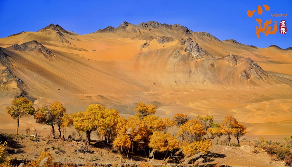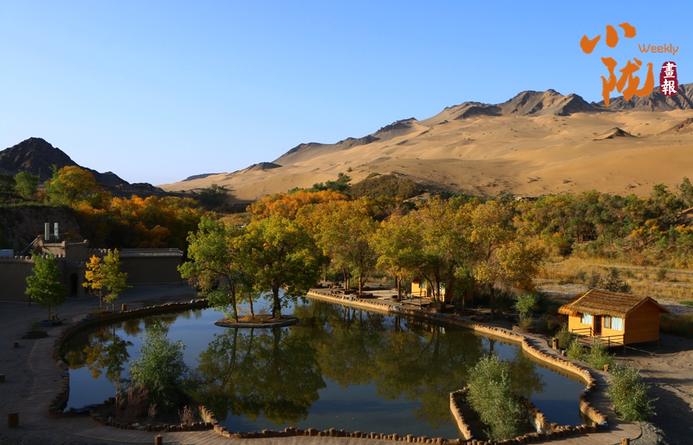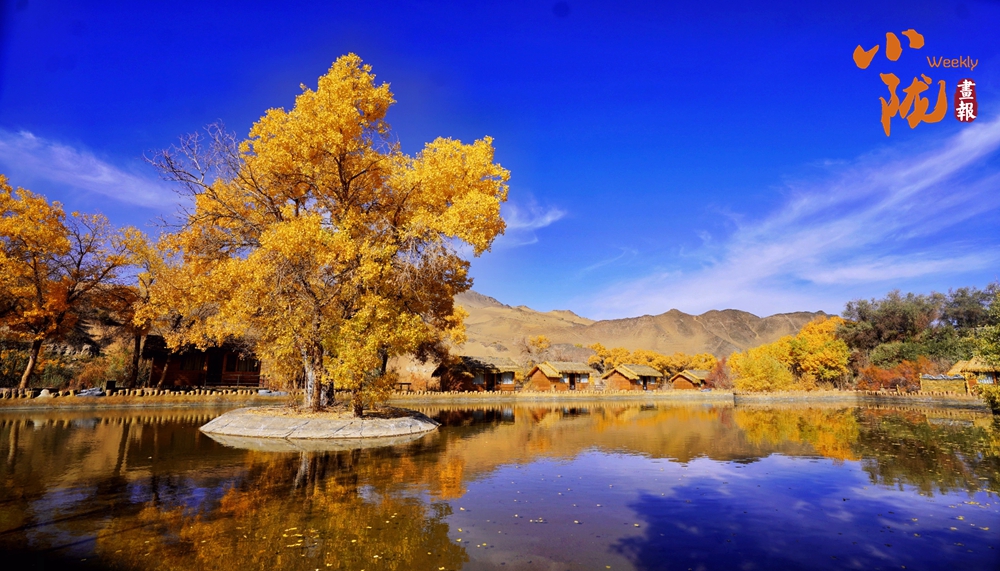 連綿起伏的沙丘如金色浪潮,環(huán)抱著一汪碧水,藍天白云倒映其中。金黃的胡楊在秋風(fēng)中輕輕搖曳,宛如一群身著華麗服飾的衛(wèi)士,默默守護著這片沙漠中的綠洲。