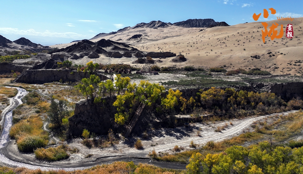 登高望遠,悠長的峽谷蜿蜒曲折、千年胡楊郁郁蔥蔥,它們有的生長在谷底、有的生長在沙崖上、有的生長在沙山間,這些野生胡楊黃綠相間、耀眼斑斕,為秋日的胡楊峽谷增添了生機與活力。