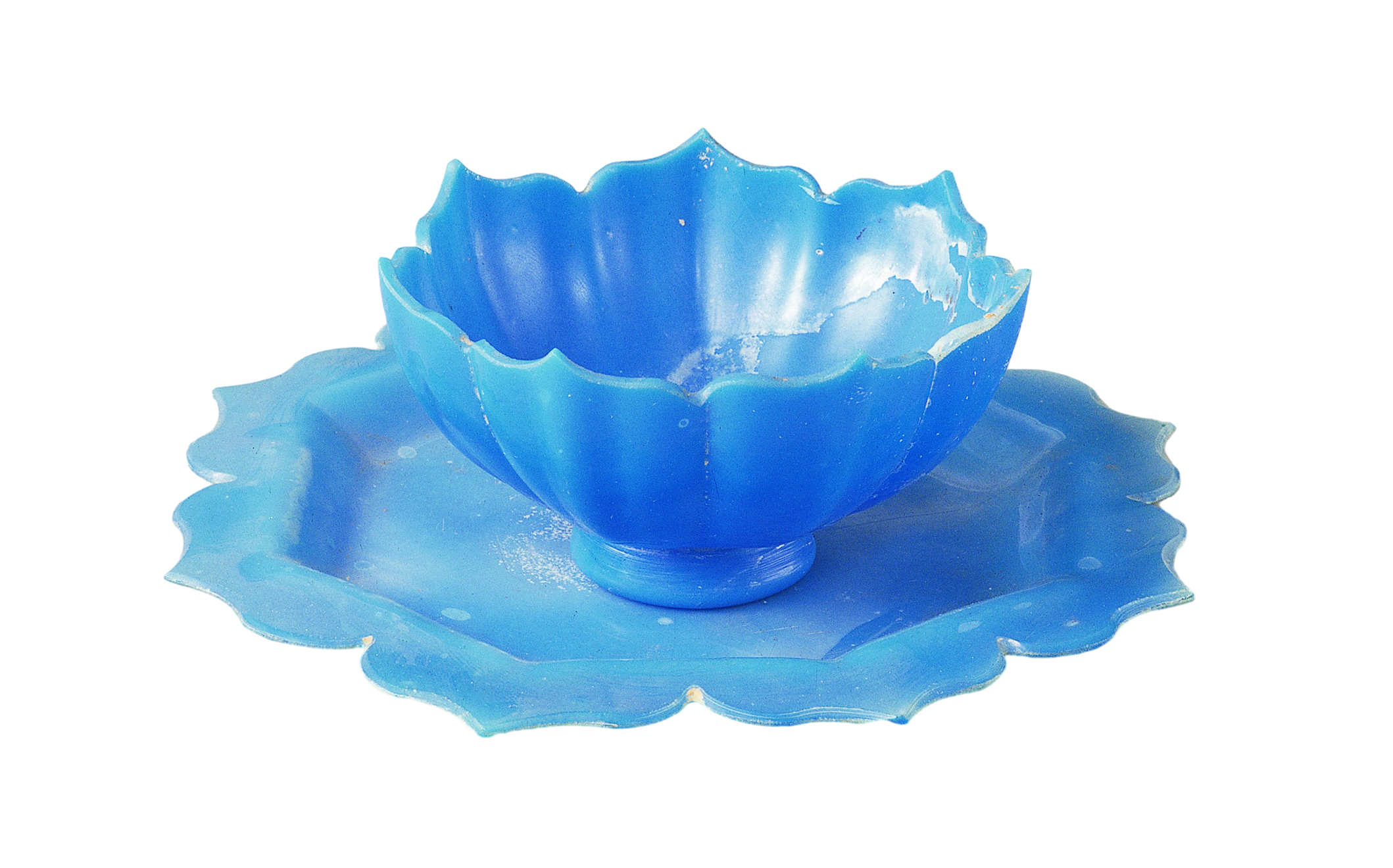 元代 漳縣汪世顯家族墓出土 盞高4.9厘米,口徑8.9厘米,底徑3.4厘米;盞托高1.2厘米,口徑15.2厘米。 玻璃托盞為普藍色玻璃制成,半透明,胎內含氣泡。盞為七瓣蓮花形,餅形足;托口為平口,邊沿呈八瓣蓮花形,平底,腹壁呈正八角形。托盞造型優(yōu)美,色彩艷麗,工藝精湛,是迄今出土最完整的一套元代玻璃托盞。