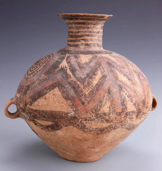 彩陶蛙紋壺,新石器時代馬家窯文化馬廠類型,高42厘米,口徑13.1厘米。壺泥質(zhì)紅陶,口外侈,薄唇,球形腹,小平底,腹部兩側(cè)對稱置雙系。于橙紅色陶衣上以黑彩描繪變形蛙紋。圖案線條流暢,富于變化,與造型協(xié)調(diào)一致。據(jù)科學測試,馬家窯文化馬廠類型彩陶的年代約為公元前2200~前2000年。變形蛙紋作為馬家窯文化馬廠類型彩陶上常見的裝飾紋樣之一,體現(xiàn)了遠古人們對于繁衍生殖的渴望。青蛙產(chǎn)下許多卵,孵出許多蝌蚪,正是繁衍旺盛的象征。