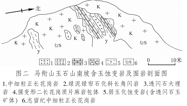 馬銜山玉礦分布在馬銜山東南部的玉石山(圖版一),海拔3028米。山上出露的地質(zhì)體主要為古元古界馬銜山巖群、中元古代片麻二長(zhǎng)花崗質(zhì)巖[3]和志留紀(jì)正長(zhǎng)花崗巖及正長(zhǎng)巖。馬銜山巖群的巖性為黑云斜長(zhǎng)片麻巖、變粒巖、斜長(zhǎng)角閃巖和白云質(zhì)大理巖,巖石普遍遭受了韌性變形,變余糜稜?zhēng)r發(fā)育。志留紀(jì)巖漿侵入期后熱液活動(dòng)較強(qiáng),石英脈細(xì)脈發(fā)育,局部見(jiàn)螢石礦化或礦床[4]。玉礦化主要產(chǎn)于馬銜山巖群與志留紀(jì)正長(zhǎng)花崗巖和正長(zhǎng)巖接觸帶上(圖版二),具體賦存在與白云質(zhì)大理巖的接觸部位,是正長(zhǎng)花崗巖及正長(zhǎng)巖與鎂質(zhì)大理巖接觸交代蝕變的產(chǎn)物[5]?;◢弾r與片麻巖、變粒巖和斜長(zhǎng)角閃巖接觸界線附近巖石雖有蝕變,但不見(jiàn)玉化蝕變巖或玉石出露。在近山頂開(kāi)采玉石揭露的一個(gè)地質(zhì)剖面清晰地顯示了這些特征(圖二)。該剖面大致呈東西走向,長(zhǎng)約50米,馬銜山巖群多呈殘留體出露,斜長(zhǎng)角閃巖綠泥綠簾石化強(qiáng)烈,大理巖普遍發(fā)生蝕變,形成透輝透閃石大理巖,緊靠花崗巖接觸地帶發(fā)育窄窄的透閃石玉礦帶?,F(xiàn)在人們找玉,也主要在該剖面上的花崗巖和鎂質(zhì)大理巖的接觸帶上鑿洞,在接觸帶上見(jiàn)有多處采挖玉石的洞穴。在該剖面西側(cè)約50米,發(fā)育有正長(zhǎng)巖與大理巖的混染帶,肉紅色正長(zhǎng)巖中包裹混染著大量灰綠色透閃透輝大理巖,部分已蝕變?yōu)橥搁W透輝石巖,且質(zhì)地較細(xì)膩,成為半玉化巖石。剖面和周圍地質(zhì)特征表明,玉礦的形成是早古生代志留紀(jì)花崗質(zhì)雜巖體侵入到古元古代鎂質(zhì)大理巖,發(fā)生接觸交代蝕變作用的結(jié)果,在兩種巖石接觸帶形成玉礦體。但并不是蝕變帶中的巖石都是透閃石玉石,透閃石玉在蝕變帶中多呈雞窩狀或不規(guī)則狀分布,少量呈脈狀出露。從剖面及部分采坑的規(guī)模來(lái)看,玉礦體向深處有變大、變好的趨勢(shì),這主要受控于接觸面產(chǎn)狀,在傾角較緩處礦體相對(duì)較大。橫向上在背離接觸面方向圍巖具有從透閃石玉到透閃透輝石玉、透閃透輝石大理巖再到含透閃石大理巖的變化特征,反映了交代蝕變強(qiáng)度與接觸帶溫度及熱液成分變化的密切關(guān)系。從玉礦體到蝕變圍巖由于成分和結(jié)構(gòu)的變化出現(xiàn)一系列不同類型的玉石或巖石。我們?cè)谄拭嫔喜杉揭恍┬K的淡綠色玉料(圖版三)和出露較寬的微晶大理巖,經(jīng)偏光顯微鏡下薄片鑒定和XRF檢測(cè),確定有透閃石玉、透輝透閃玉、透閃透輝石玉、透閃透輝石大理巖和含透閃石大理巖等,這與馬家窯遺址出土的齊家文化時(shí)期大部分玉質(zhì)品玉料類型基本一致[6]。部分地段近礦圍巖還有透輝石巖、透輝矽卡巖、矽卡巖化大理巖、蛇紋石化大理巖、斜長(zhǎng)透輝石巖等。玉石山的采洞(坑)由于資源與環(huán)境保護(hù)的要求,大多已被填埋,但仍可見(jiàn)采坑殘留的位置。采洞(坑)均位于大理巖與正長(zhǎng)花崗巖接觸帶靠近大理巖一側(cè),這也間接顯示了玉礦體的位置。此外,玉石山花崗巖中石英細(xì)脈較發(fā)育,局部可見(jiàn)螢石礦化,反映了花崗巖侵入期后低溫?zé)嵋夯顒?dòng)仍較強(qiáng),對(duì)玉礦也有一定的改造影響。
