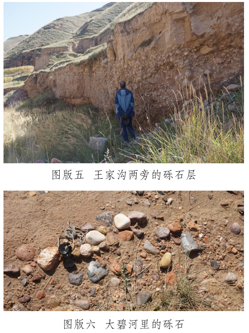 玉石山南麓有一條自東向西流過(guò)峽口鎮(zhèn)注入洮河的河——大碧河,《狄道州志》里稱為“打璧河” [12]。玉石山和山下大碧河之間有幾條溝,這些溝是上玉石山的必經(jīng)道路,也是雨水夾帶山上的石頭注入大碧河的通道。在甘肅臨洮馬家窯文化研究院李家功的引領(lǐng)下,我們對(duì)大碧河中下游和通往玉石山的三條支溝進(jìn)行了較系統(tǒng)的調(diào)查,調(diào)查方法是在訪問(wèn)當(dāng)?shù)赜嘘P(guān)人員的基礎(chǔ)上,進(jìn)行野外實(shí)地考察。大碧河連接玉石山的支溝主要有三條:第一條大溝是王家溝,是玉石山和峽口鎮(zhèn)之間的通道,大雨過(guò)后附近的村民往往會(huì)在這條溝里撿到玉石。在王家溝靠近玉石山的茨泉子村,十多戶村民都拿出自己在溝中揀到的十余件山流水玉料(圖版四)供我們觀察、檢測(cè)。玉料大小不一,大者長(zhǎng)軸約30厘米,多呈次圓狀,均有玉皮,內(nèi)部質(zhì)地多細(xì)膩,肉眼鑒定和XRF檢測(cè)結(jié)果表明,玉石主要包括黃綠色(含草花)透閃石玉、透輝透閃石玉及透閃石大理巖,另外還有螢石料。王家溝下游匯入大碧河入口段,發(fā)育三級(jí)階地,前人使用大型機(jī)械開(kāi)挖二、三級(jí)階地礫石層(圖版五),據(jù)說(shuō)在其中找到較多玉料,現(xiàn)政府已叫停。在階地礫石層中我們也撿到淺黃綠色透輝透閃石大理巖及半玉化的大理巖礫石,這些礫石是玉石山玉礦的近礦圍巖。王家溝匯入大碧河,因此大碧河中也可以撿到從王家溝滾落的玉石山上的玉石和其它巖石。我們?cè)诖蟊毯訊{口鎮(zhèn)段揀到較多直徑約3~5厘米來(lái)自玉石山的透閃石大理巖,巖石磨圓度高,成球狀或橢球狀,質(zhì)地較細(xì)膩。據(jù)當(dāng)?shù)厝酥v,也有人在大碧河峽口鎮(zhèn)段撿到過(guò)小塊的玉石;第二條溝是小溝——漆家溝,位于王家溝西面,雖位于玉石山正面,但鮮有聽(tīng)到在溝里撿到玉石的消息;第三條溝是王家溝東面的石景峽,距離玉石山相對(duì)較遠(yuǎn),其溝腦是玉石山的東延部分。《狄道州志》里載“打璧河,在州北三十里,源出石井峽,即打璧谷” [13]。這里的“石井峽”可能就是現(xiàn)在所說(shuō)的“石景峽”,峽中腰有水冒出。但現(xiàn)在的大碧河不源于石景峽,而是源于洮河和渭河的分水嶺。石景峽雖可能是史籍上的打璧谷,且在峽里也撿到了透閃石大理巖礫石,但沒(méi)有發(fā)現(xiàn)玉石器和玉料。