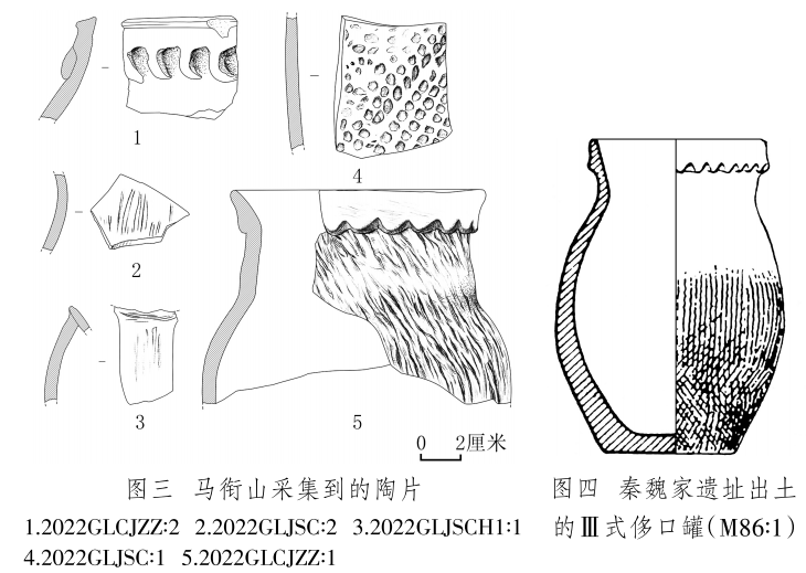 陶片 2片,2022GLCJZZ∶1,罐殘片,夾砂紅陶,腹部以下缺失。侈口,上有煙熏痕跡。短頸,頸上部有一圈鋸齒狀凸飾,鼓腹,頸部和腹部滿飾粗繩紋。復(fù)原口徑12、器壁厚0.6~1、殘高10厘米(圖三,5)。與秦魏家遺址出土的齊家文化Ⅲ式侈口罐(圖四)[16]形制相似。2022GLCJZZ∶2,罐口沿殘片,夾砂紅陶??谘叵掠性卵罓罡郊佣鸭y??谘貧堥L(zhǎng)5.3、殘高4.8、厚0.7厘米(圖三,1)。