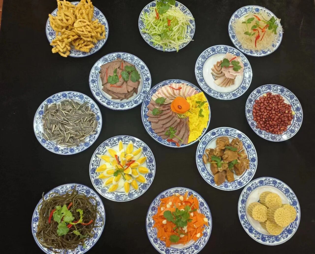 ——“十三花”,寓意胡太后以民為本的執(zhí)政理念;城內(nèi)四個(gè)葷菜,寓意人民四季安康、幸福美滿;骨頭碟和懸肉碟,寓意父骨母血、尊老孝親;肝子碟和雞蛋碟,寓意肝膽相照、心心相印;四個(gè)水菜碟子水圍城,寓意順風(fēng)順?biāo)?、四方平安;城外瓜籽花生碟,寓意多子多福、多祿多壽;路食和果子,寓意衣豐食足、一路平安;最中間一個(gè)大碟全盤為中心,寓意團(tuán)結(jié)聚力、天下一心。