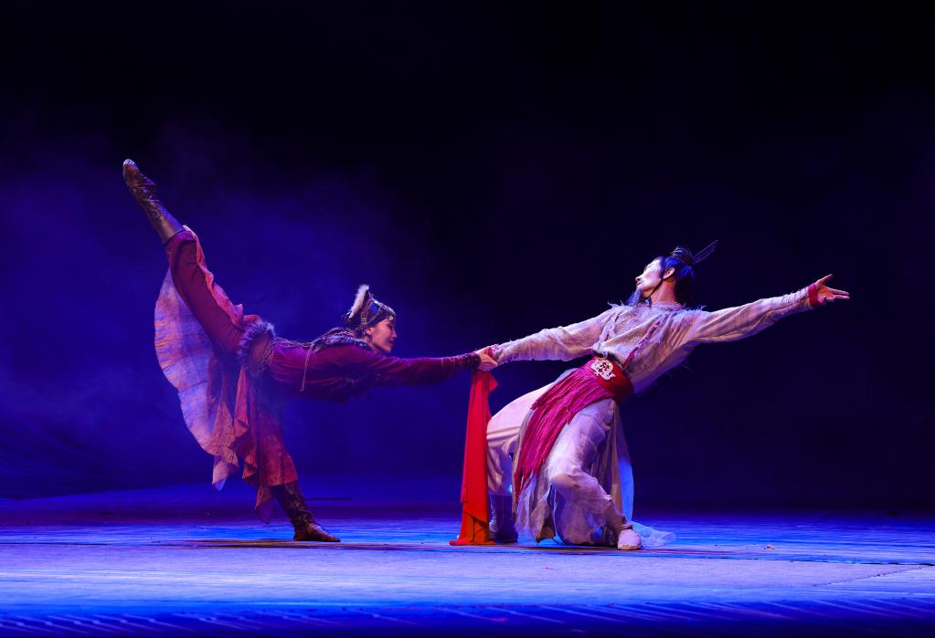 10月27日晚,在烏魯木齊文化中心大劇院,演員在舞劇《張騫》中表演。 10月27日晚,以漢代張騫出使西域為藍本創(chuàng)作的重大歷史題材舞劇《張騫》,在烏魯木齊文化中心大劇院首演。該劇由《授節(jié)》《守節(jié)》《傳節(jié)》《使節(jié)》四幕組成,演繹了張騫出使西域的“鑿空之旅”,展現(xiàn)了各民族廣泛交往、全面交流、深度交融的生動場景。 新華社記者 王菲 攝
