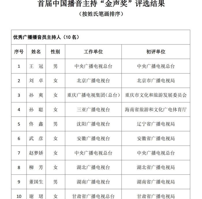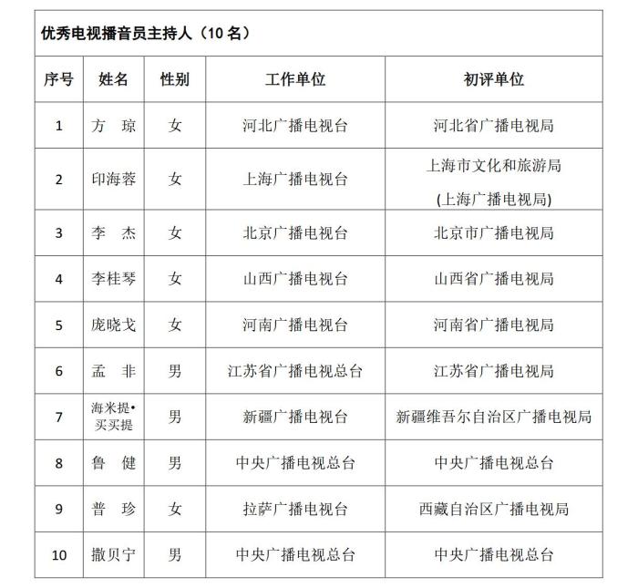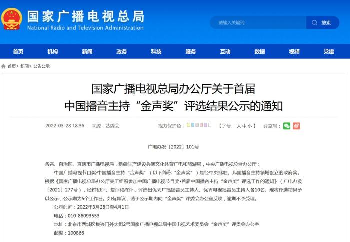《通知》指出,根據《國家廣播電視總局辦公廳關于組織參加中國廣播電視節(jié)目獎•首屆中國播音主持“金聲獎”評選工作的通知》(廣電辦發(fā)〔2021〕277號),經過初評、復評和終評,評選出優(yōu)秀廣播播音員主持人、優(yōu)秀電視播音員主持人各10名?,F將評選結果予以公示,公示期為5個工作日。