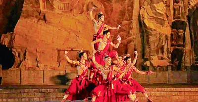 從中華優(yōu)秀傳統(tǒng)文化中尋找藝術(shù)基因和創(chuàng)作靈感的文藝佳作不斷涌現(xiàn),一部部舞臺表演藝術(shù)作品“破圈”而來,精彩紛呈。河南衛(wèi)視2021年七夕節(jié)制作的《七夕奇妙游》中以龍門石窟石刻圖像飛天和金剛為素材編創(chuàng)的實(shí)景舞蹈《龍門金剛》,就是其中的杰作之一。懷抱樂器的伎樂天從洞窟中飛出,在大佛的注視下翩翩起舞,金剛力士形象逼真、栩栩如生。藝術(shù)家賦予傳統(tǒng)文化遺存跨越歷史的藝術(shù)魅力。古風(fēng)豫韻舞蹈藝術(shù)與龍門石窟悠久的歷史文化相得益彰,將“文化+旅游”的精髓和深意作了深刻的演繹和闡釋。