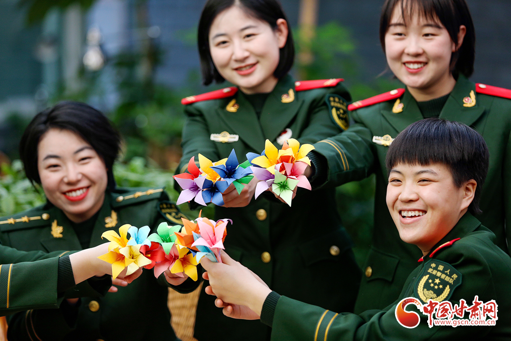 蘭州支隊(duì)十七中隊(duì)女兵通過(guò)折千紙鶴和百合花喜迎節(jié)日的到來(lái)。