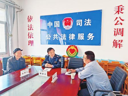 全國模范人民調解員、和政縣司法局三合司法所所長張仲勝傾心調解矛盾糾紛(4月20日拍攝)。 新甘肅·甘肅法制報記者陳孝志攝