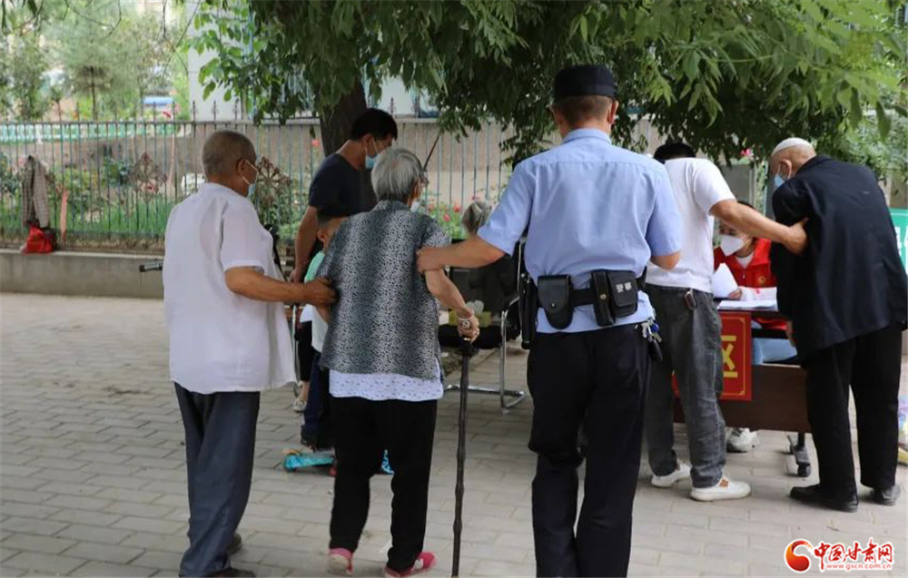 紅古分局海石灣派出所民警在核酸采樣點主動攙扶行動不便的老人進行核酸采樣。紅古分局 張 鼎/攝