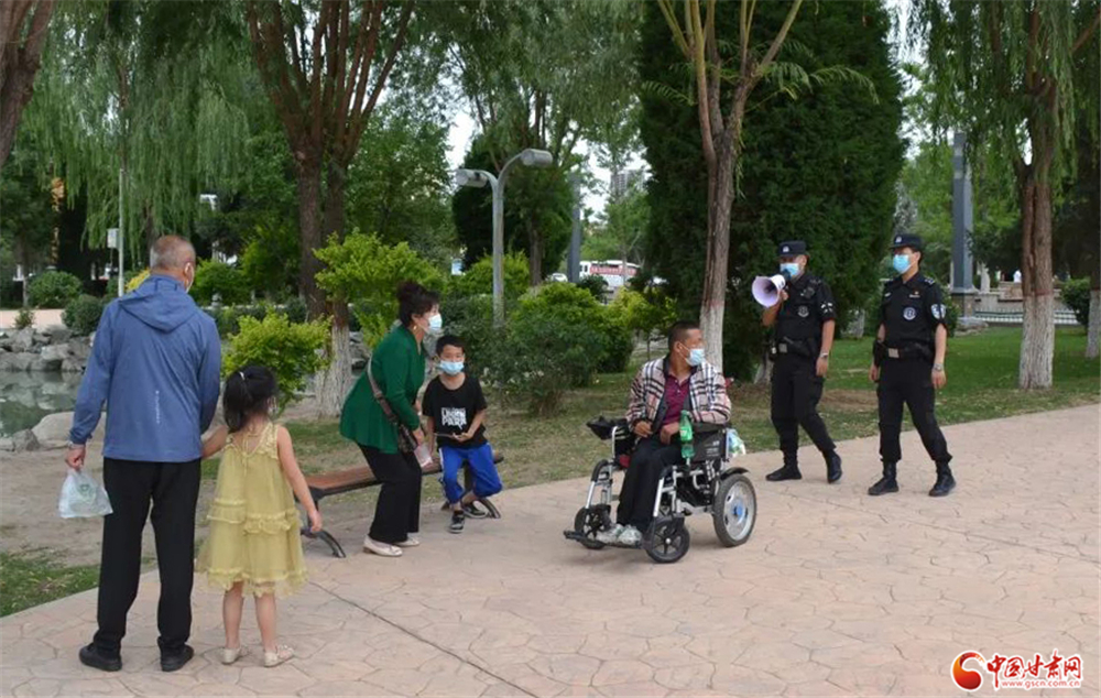 永登公安巡邏特警隊員在公園等公共場所手持小喇叭勸導群眾戴口罩少聚集不出門。永登縣局 徐大明/攝