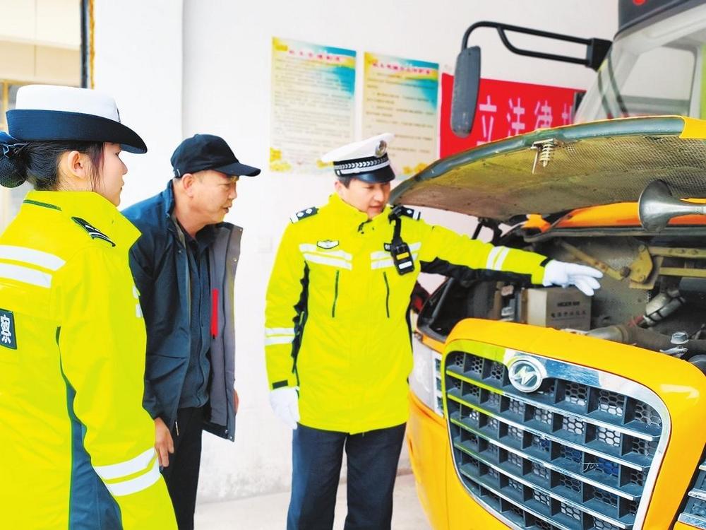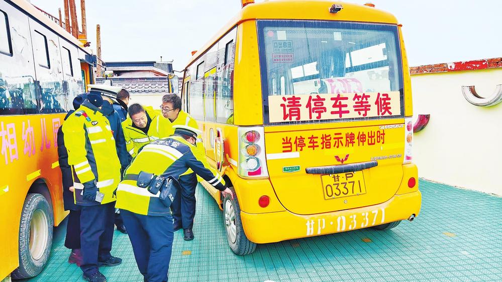 民警在檢查幼兒園校車。開(kāi)學(xué)在即,為保障學(xué)生上下學(xué)乘車安全,2月18日,臨潭縣公安局交警大隊(duì)聯(lián)合縣交通運(yùn)輸局對(duì)校車開(kāi)展“安全體檢”。 新甘肅·甘肅法治報(bào)記者金凡裕攝