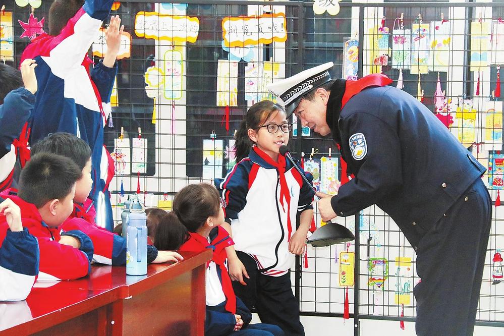 民警與同學(xué)生互動交流。2月26日,蘭州市公安局交警支隊紅古大隊民警走進(jìn)學(xué)校,開展“小手牽大手”交通安全宣傳活動。新甘肅·甘肅法治報記者王輝攝
