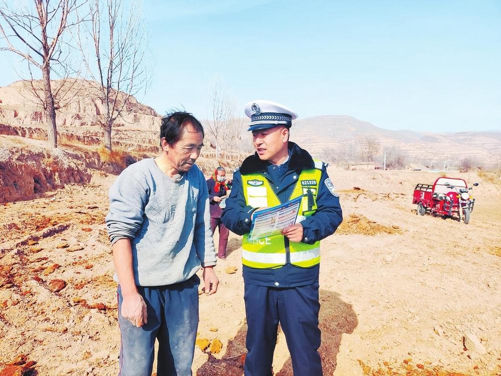 民警向群眾講解法律法規(guī)。3月10日,隴西縣公安局渭陽派出所民警深入田間地頭,開展道路交通安全和反電詐宣傳。 新甘肅·甘肅法治報通訊員劉榮攝