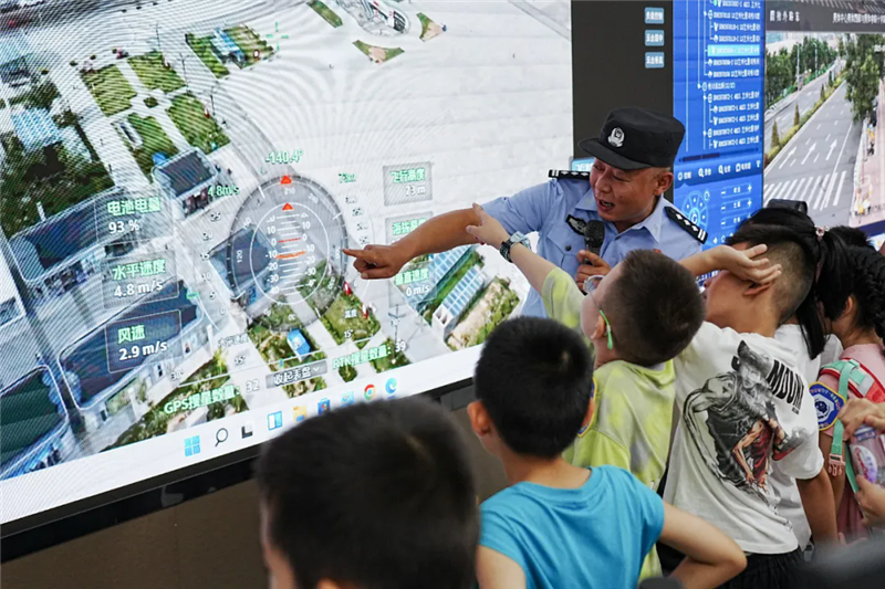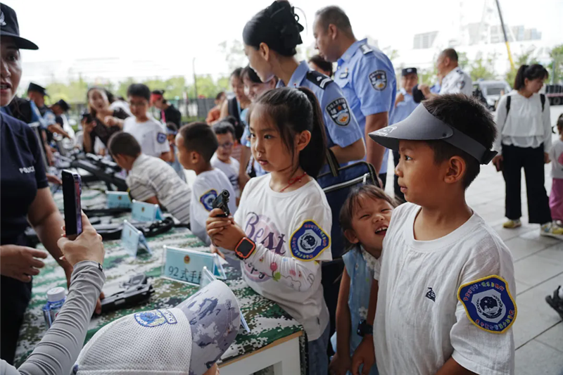 帶著興奮和期待,小朋友們的警營探索之旅開始了!在奧體中心警務(wù)站和警航作戰(zhàn)單元,他們沉浸式參觀了現(xiàn)代警務(wù)工作和警用無人機(jī)的指揮調(diào)度,直觀了解了公安工作的日常場(chǎng)景。另一邊,小朋友們?cè)诿窬闹笇?dǎo)下,一個(gè)個(gè)親手拿著警用武器裝備零距離“拍照打卡”,“這個(gè)好酷!”“看我的!”小朋友們的驚嘆聲此起彼伏。