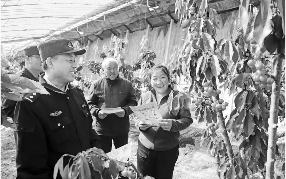 3月10日,西峰公安分局顯勝派出所民警走進(jìn)櫻桃大棚開展食品安全宣傳活動。新甘肅·甘肅法治報通訊員 左棟 攝
