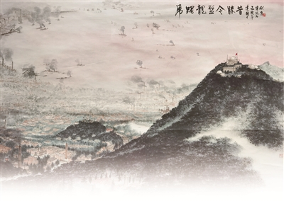 1949年4月23日,人民解放軍占領(lǐng)南京。毛澤東聞訊后,欣然寫下這首詩,描寫了人民解放軍橫渡長江、解放南京的雄偉壯闊、氣勢磅礴場面。在畫作中,畫家描繪的是南京城的壯麗景色,沐浴在朝暉之中的紫金山及其周圍景致,以浪漫的詩意呈現(xiàn)出來。近處,紫金山巍峨高聳,天文臺亦清晰可見;中景,江上輪渡往來,兩岸工廠林立,煙霧繚繞;遠處,紅霞爛漫,水天一色。新中國成立后的南京繁忙而祥和,墨色淋漓間,新中國欣欣向榮的景象躍然紙上。