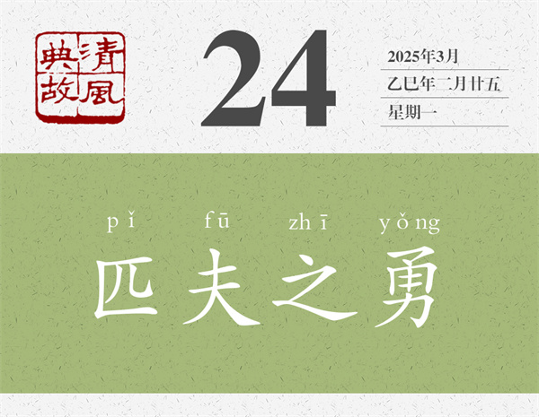 “匹夫”指平民百姓,也指平常人、一般人。起碼在孔子那里,還沒有貶義?!墩撜Z·子罕》:“子曰:‘三軍可奪帥也,匹夫不可奪志也。’”在韓非那里也一樣,《韓非子·有度》:“刑過不避大臣,賞善不遺匹夫。”但典出《國語》的“匹夫之勇”則用來指稱毫無智謀,單憑一己之力蠻干的勇氣,已經(jīng)沒有任何褒義了。《孟子·梁惠王下》:“王請無好小勇。夫撫劍疾視曰,‘彼惡敢當(dāng)我哉!’此匹夫之勇,敵一人者也。”孟子將“匹夫之勇”稱為“小勇”。蘇軾《留侯論》:“匹夫見辱,拔劍而起,挺身而斗,此不足為勇也。”蘇軾則將“匹夫之勇”視為“不足為勇”。