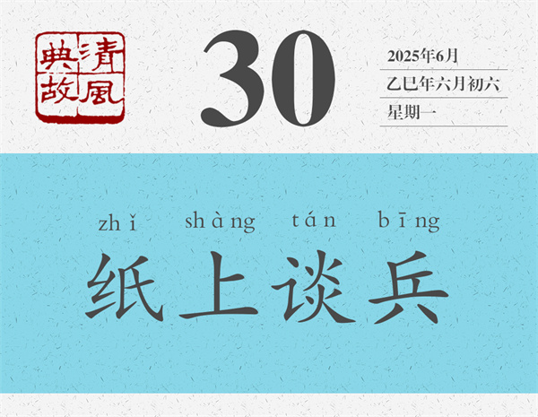 這就是歷史上著名的長(zhǎng)平之戰(zhàn)。后人即根據(jù)趙括只會(huì)照搬兵書而不知變通之事,引申出“紙上談兵”之典,比喻只會(huì)紙上空談,而不能解決實(shí)際問題,或者只會(huì)空發(fā)議論,而得不到真正落實(shí)。清人張問陶詩(shī)《即事》:“紙上談兵壁上觀,立言先慮立功難。”