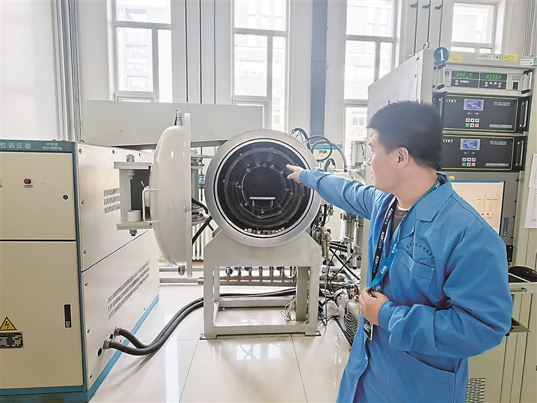 中國(guó)科學(xué)院空天信息創(chuàng)新研究院行波管工藝技術(shù)負(fù)責(zé)人劉泳良介紹高溫真空釬焊爐的用途。左翰嫡 攝