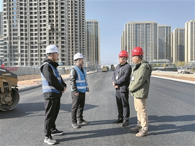 在蘭州市城關區(qū)五里鋪片區(qū)B650-1-2#路段施工現(xiàn)場,記者看到,伴隨著攤鋪機緩緩前行,施工人員與機械相互配合作業(yè),正完成收尾工作。