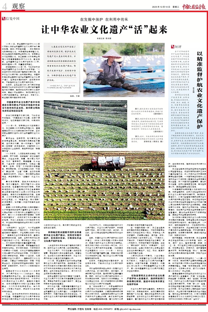 農(nóng)業(yè)文化遺產(chǎn)保護任重道遠。申遺成功并非終點,而是新的起點,后續(xù)仍需持續(xù)挖掘和推廣系統(tǒng)價值。屬地紀(jì)檢監(jiān)察機關(guān)立足職能職責(zé),主動將農(nóng)業(yè)文化遺產(chǎn)保護納入監(jiān)督重點,著力推動農(nóng)業(yè)文化遺產(chǎn)在發(fā)掘中保護、在利用中傳承,推進中華優(yōu)秀農(nóng)耕文化保護傳承。