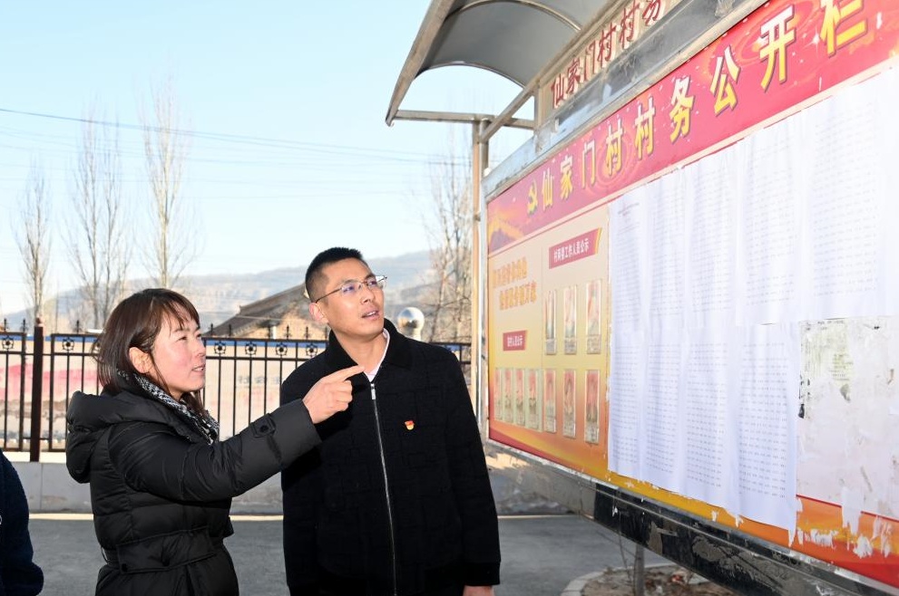 隴西縣紀委監(jiān)委推動加大農村集體“三資”公示公開力度,督促各村(社區(qū))綜合運用管理平臺、村務公開欄等,及時公開“三資”管理使用情況。圖為近日,該縣文峰鎮(zhèn)紀檢監(jiān)察干部在仙家門村查看公開公示情況。崔翔龍 攝