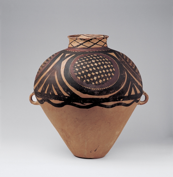 馬廠類型,蘭州市土谷臺出土??趶?3.9厘米,底徑12厘米,高44.5厘米。泥質(zhì)橙黃陶。施黑,紅彩,口內(nèi)繪一圈帶紋和連弧紋,頸部繪菱格紋,肩腹部用黑紅兩色繪二方連續(xù)的四大圓圈紋,圓圈內(nèi)填方格紋。腹中部繪黑色帶紋和一圈水波紋。四大圓圈紋,顯示了馬廠類型彩陶的獨特文化風格。