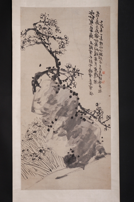 清代,水墨花鳥畫立軸,吳昌碩、王一亭合作,紙本??v128.5厘米,橫63.3厘米。款署“乙卯春一亭種水仙搬頑石,吳昌碩補梅并題”;鈐“缶翁”白文方印、“一亭父”朱文方印。構(gòu)圖險奇,巨石斑駁渾厚,梅樹老干椏槎(chá),鐵骨錚錚,新枝旁出,穿插于其間,凌空屈曲,花開數(shù)朵,疏落有致,石旁水仙茂盛,纖塵不染。吳昌碩、王一亭合璧之作。