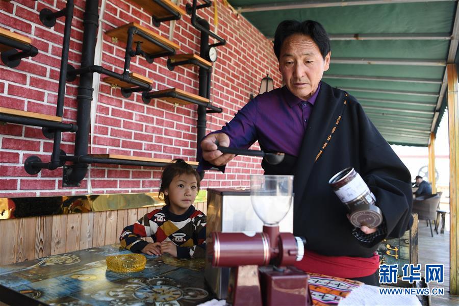 午后,草原上的天空一碧如洗,在海拔3300米的甘肅省甘南藏族自治州碌曲縣尕海鎮(zhèn)尕秀村,57歲的村民格日扎西正在自己的牧家樂里熟練地制作現(xiàn)磨咖啡,引來幾名游客用手機拍攝。