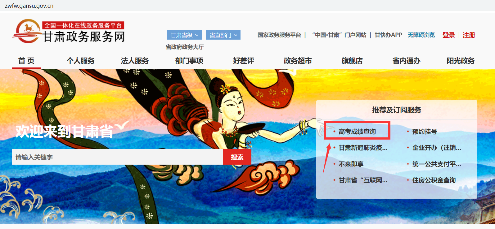 打開“甘肅政務(wù)服務(wù)網(wǎng)”https://zwfw.gansu.gov.cn/,在首頁“推薦及訂閱服務(wù)”欄目,點(diǎn)擊“高考成績查詢”進(jìn)入查詢頁面,輸入考生號(hào)、身份證號(hào)即可查詢。