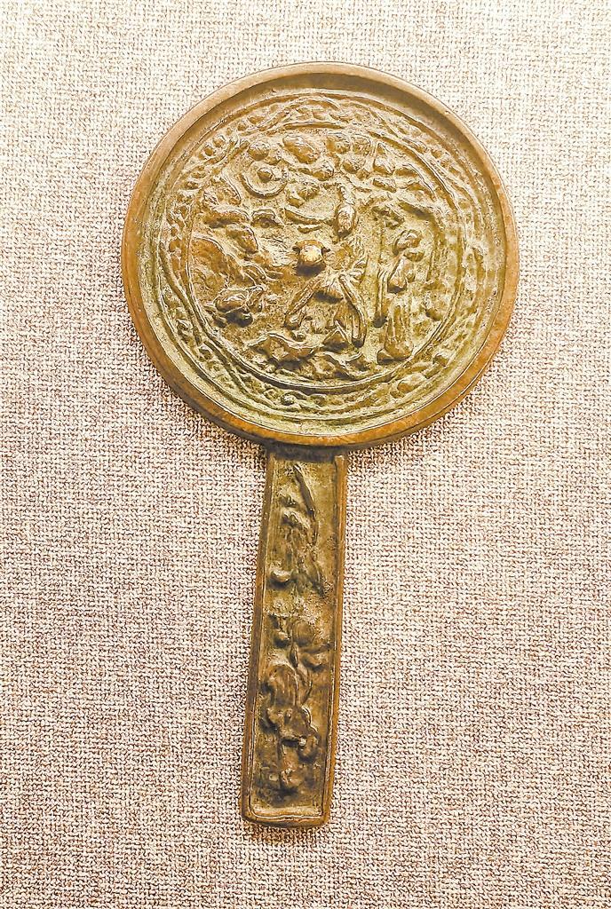 平?jīng)鍪胁┪镳^藏,宋代,圓形帶長(zhǎng)柄,長(zhǎng)柄鏡內(nèi)切圓形兩層,圓鈕。內(nèi)區(qū)圓內(nèi)淺浮雕飾三人,一束冠長(zhǎng)袖模樣人物居中,腳踩山石而坐,呈傾聽狀,左側(cè)一人雙腿屈膝跪地,似訴說狀,右側(cè)筆直而立一長(zhǎng)袖戴冠侍從,侍從右旁樹木繁茂向左傾覆,周邊山石點(diǎn)綴。柄上鑄圖案。