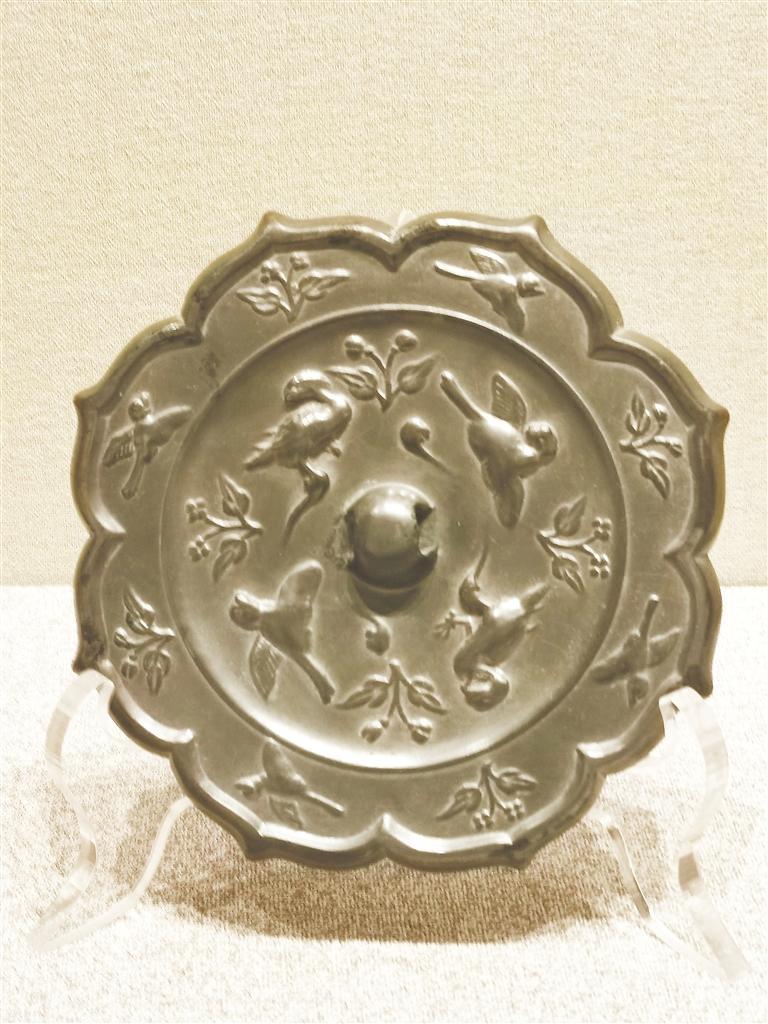 平?jīng)鍪胁┪镳^藏,唐代,八瓣菱花形,內(nèi)切圓形,圓鈕。上下左右交隔對(duì)稱分布四只鸞鳥、四枝二葉二苞折枝花。