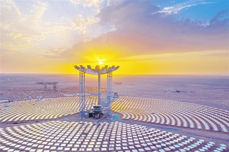 一排排風(fēng)電機(jī)組整齊列陣迎風(fēng)旋轉(zhuǎn),蔚然壯觀;成片的光伏板將茫茫戈壁裝點(diǎn)成浩瀚的藍(lán)色海洋,熠熠生輝;上萬塊定日鏡和吸熱塔構(gòu)成超級(jí)鏡子發(fā)電站,耀眼且震撼。