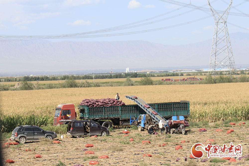 腳下有稻田,耳邊有水聲。帶著泥土的洋蔥整跺碼放,依次裝進(jìn)卡車?yán)铮r綠的高原夏菜在田間地頭收割后送進(jìn)發(fā)往南方的冷柜,百畝靑儲(chǔ)玉米經(jīng)過壓縮打包等待進(jìn)入牧場(chǎng)糧倉(cāng)……祁連山下秋收正在火熱進(jìn)行中。