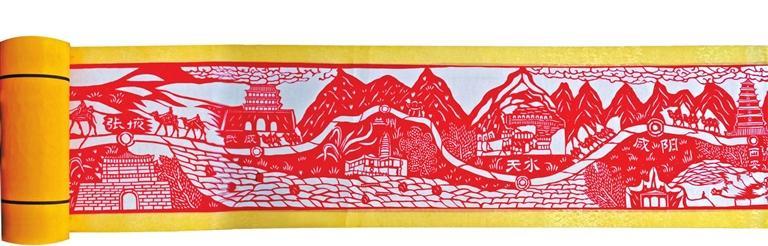 用剪紙藝術(shù)再現(xiàn)古絲綢之路的盛景,國家級(jí)非遺項(xiàng)目定西剪紙省級(jí)代表性傳承人付忠民經(jīng)過長時(shí)間的構(gòu)思和調(diào)研,又歷經(jīng)5個(gè)月,終于創(chuàng)作出了長達(dá)23.38米的剪紙長卷——《古絲綢之路全圖》,再現(xiàn)了絲路古道的文化藝術(shù)魅力,該長卷曾一舉創(chuàng)下世界紀(jì)錄協(xié)會(huì)“世界上最長的剪紙長卷”的世界紀(jì)錄。