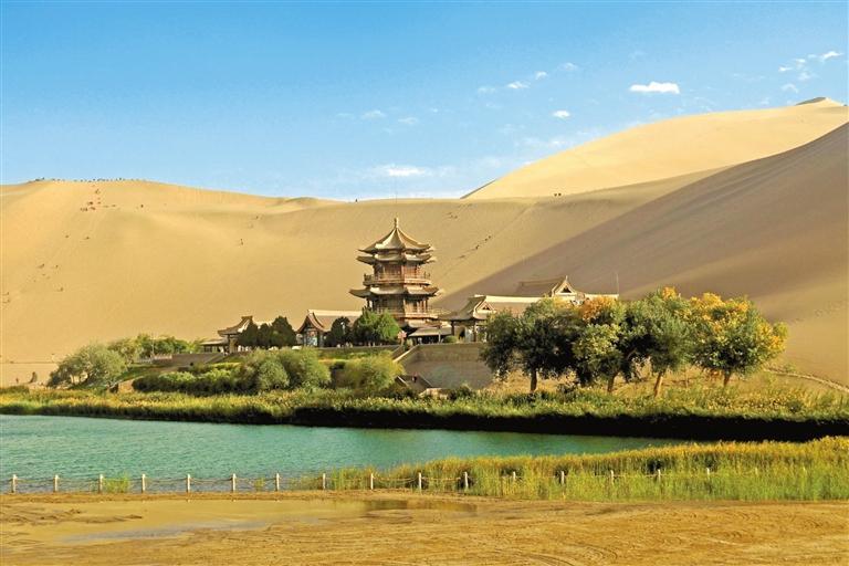 這是10月4日拍攝的甘肅省敦煌市鳴沙山月牙泉景區(qū)。金秋時節(jié),神州大地秋景如畫,盡顯大美中國山河錦繡。 新華社照片